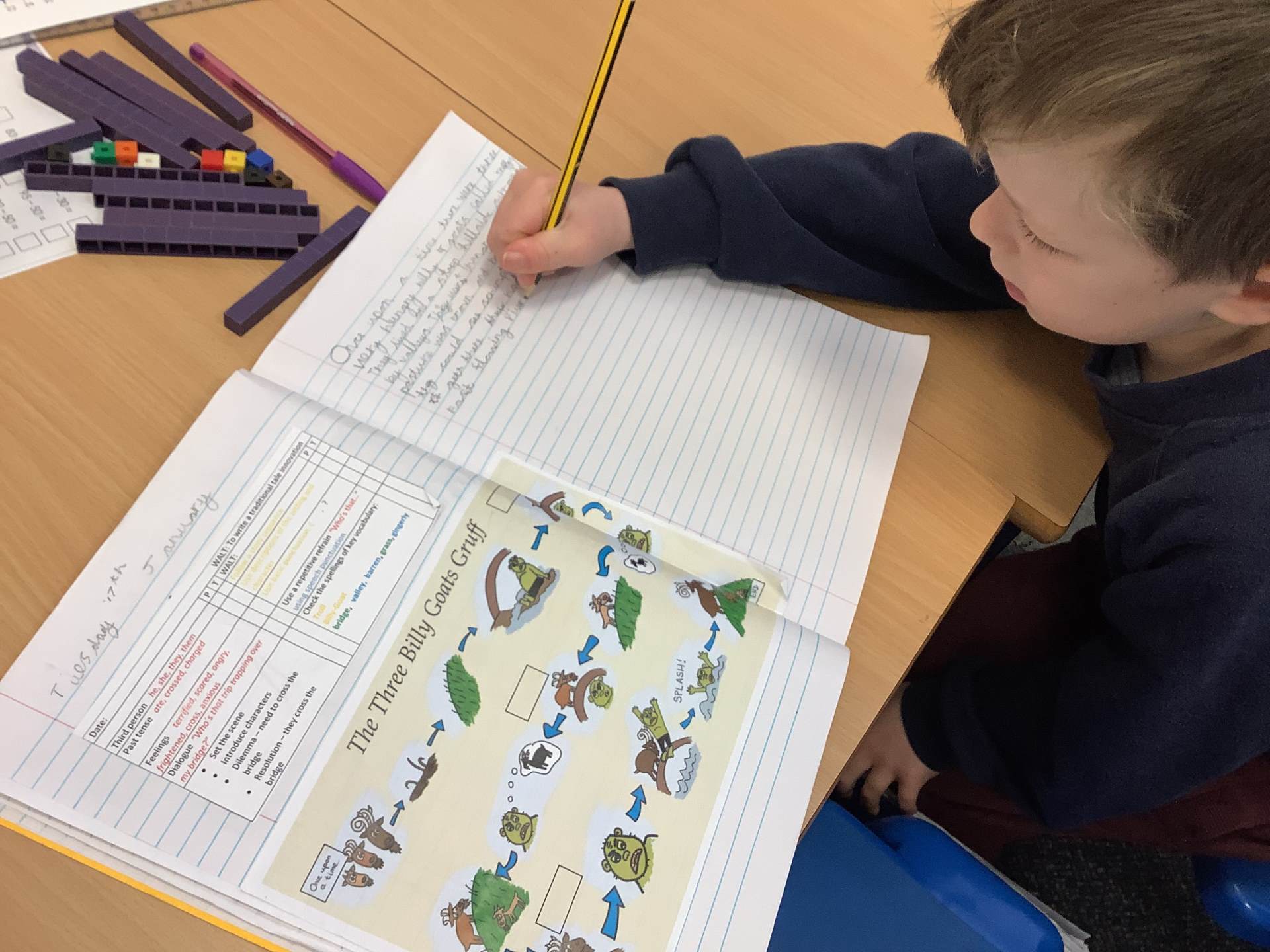 Week 1 is all about immersion and inspiration: For example, in order to hook the children into their ‘Three Billy Goats Gruff’ story-writing, Beech Class had so much fun dressing Mrs Hodges as a troll! Once they had finished their gruesome masterpiece, the class acted out the story in the playground by creating their own bridge to cross, with the terrible troll hot on their heels. By the end of the first week, after being immersed in other examples of this genre and after finding features and practising relevant grammar and punctuation, the children were feeling very secure with the story and ready to share-write it.